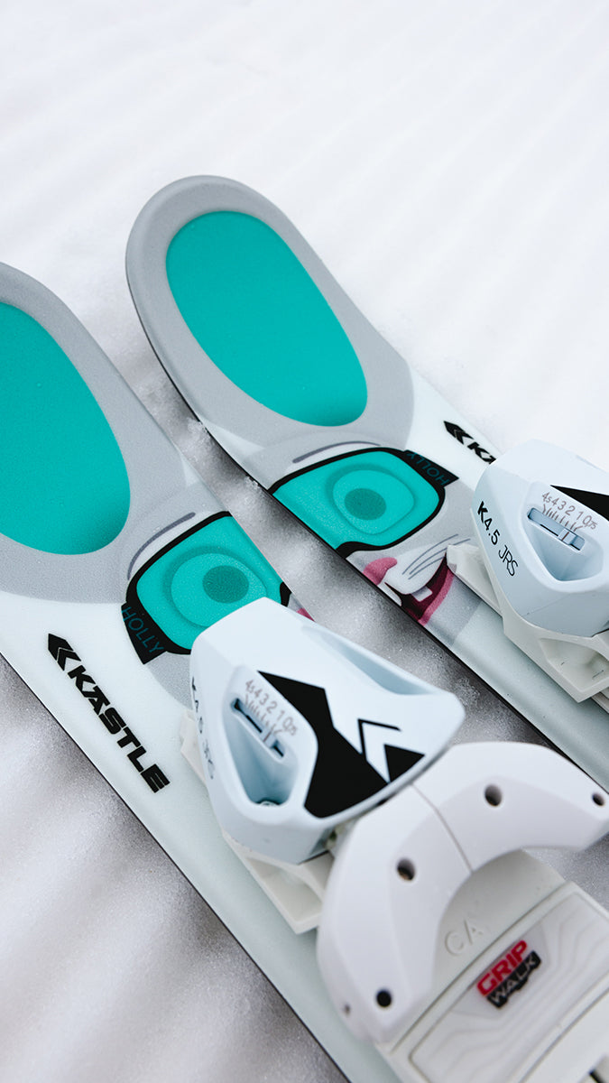 High-quality kids ski with a natural wood core and our mascot, "Holly".