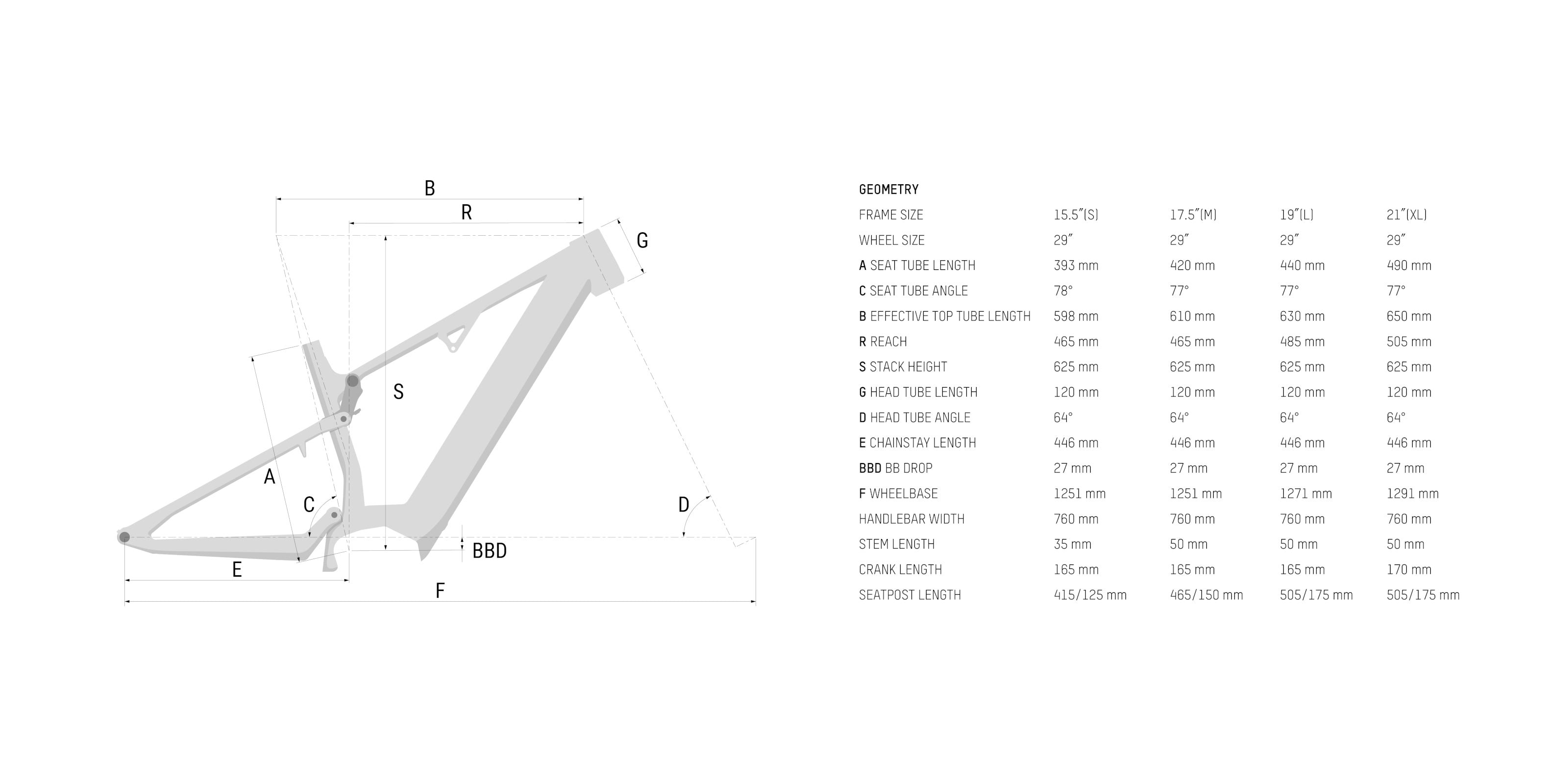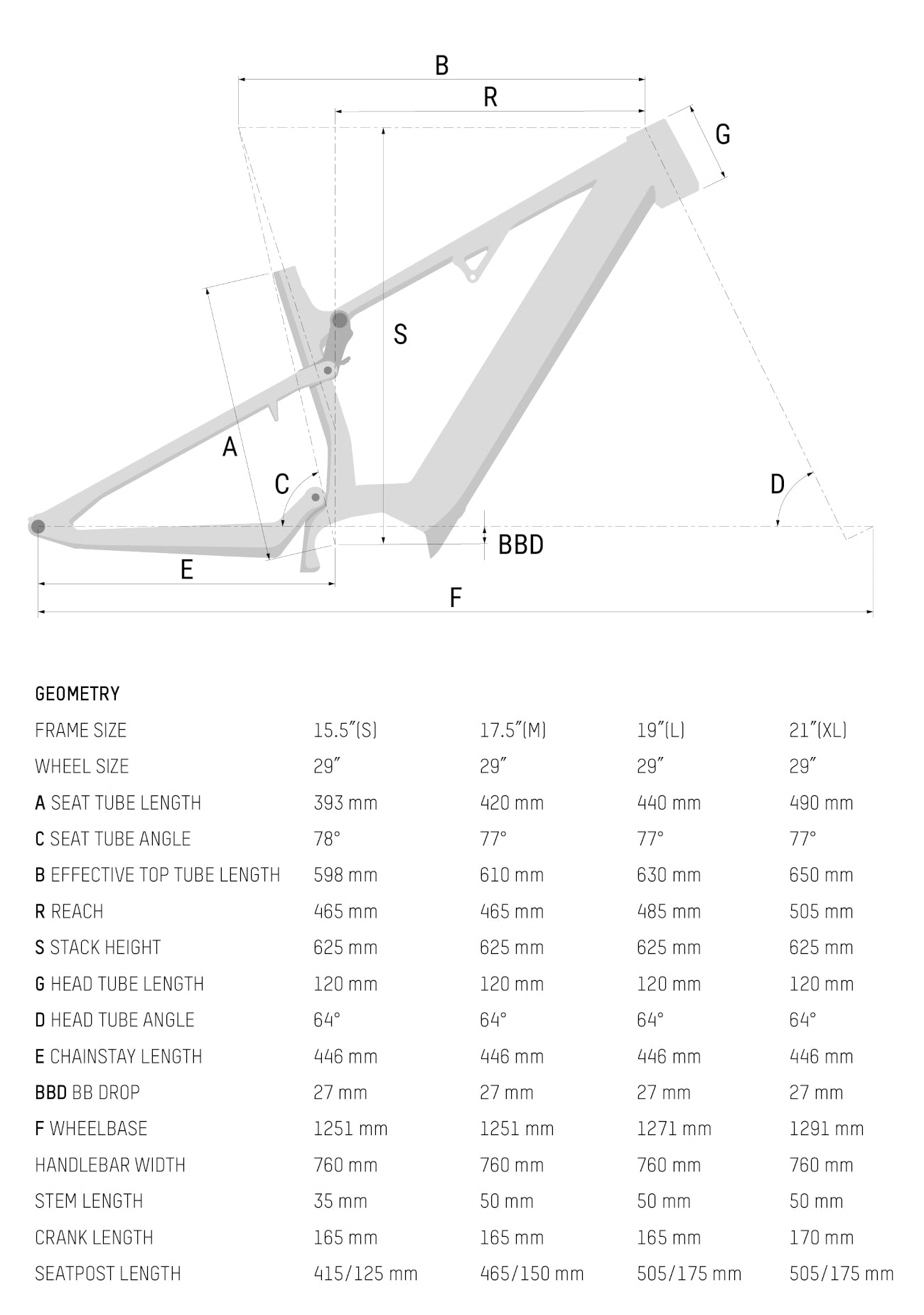 15.5” (S), 17.5” (M), 19.0” (L), 21.0” (XL)